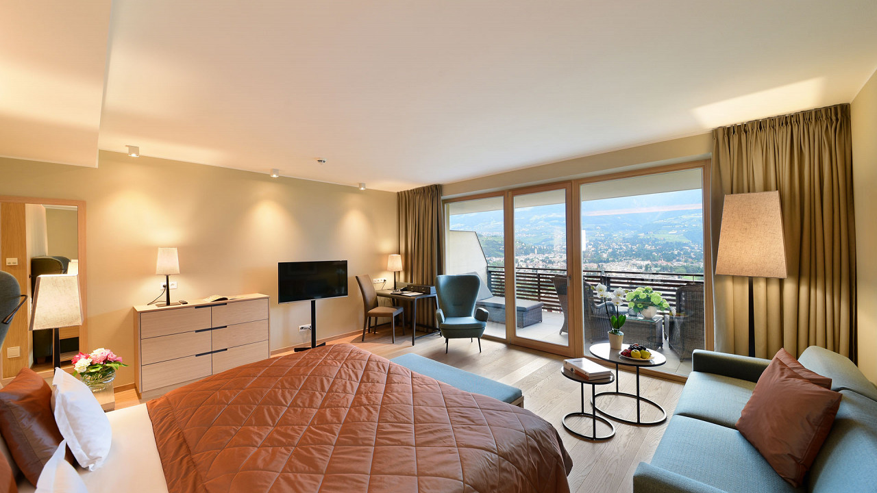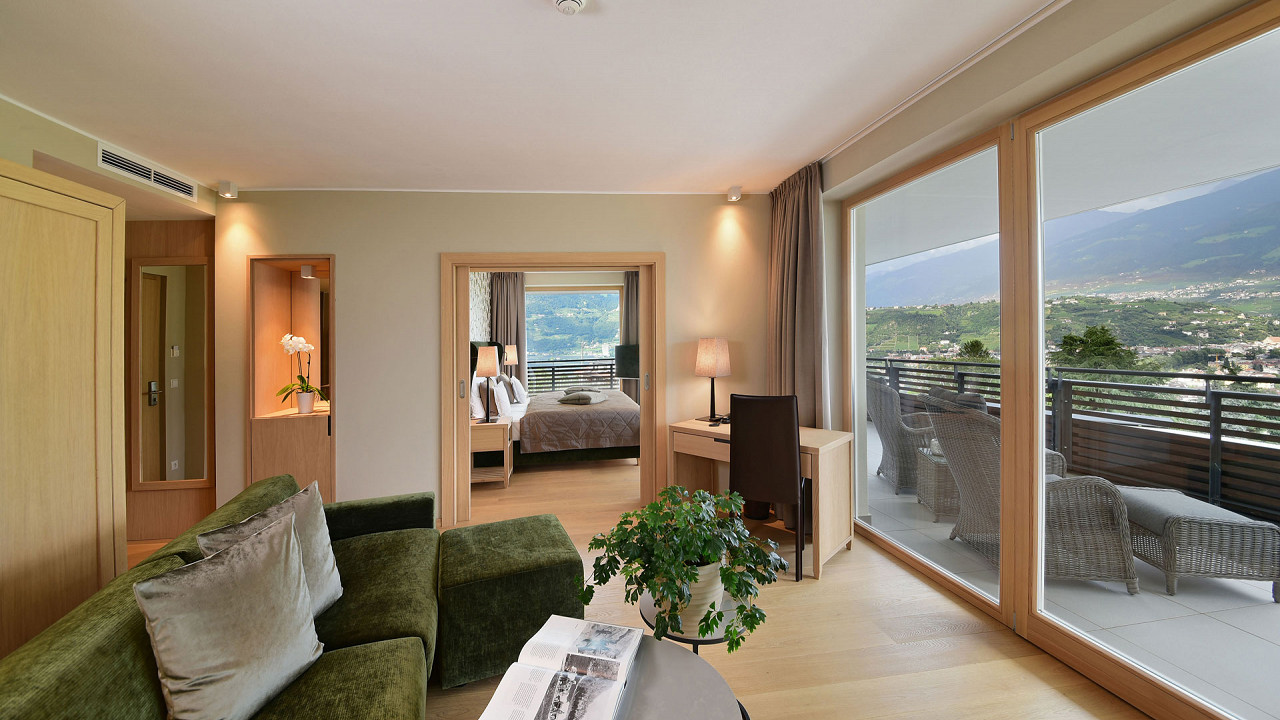Люкс с отдельной гостиной и спальней, большой балкон с видом на Мерано, ванна и душ или только душ, отдельный туалет, де...