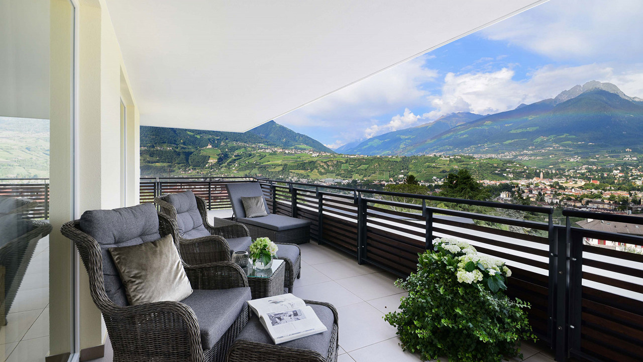 Благодаря своему панорамному расположению отель обеспечивает просто божественный обзор, будучи окружен виноградниками, фруктовыми садами и своим собственным обширным парком, откуда открывается великолепный вид на термальный курортный город Мерано.